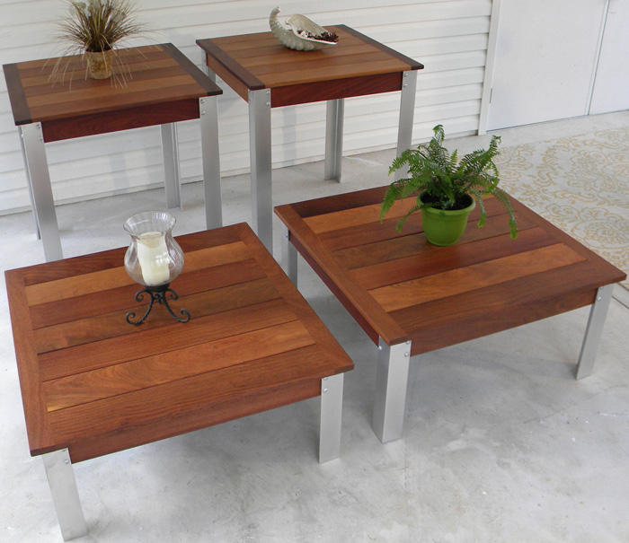 The coffee tables are a hybrid combination of exotic Cumaru hardwood and aluminum. The table top is created with a classic rail and stile construction with 10mm Beech Domino loose tenon joinery. The table top surface and apron are made from Cumaru. The aprons are attached to the top surface with forged stainless steel fasteners.