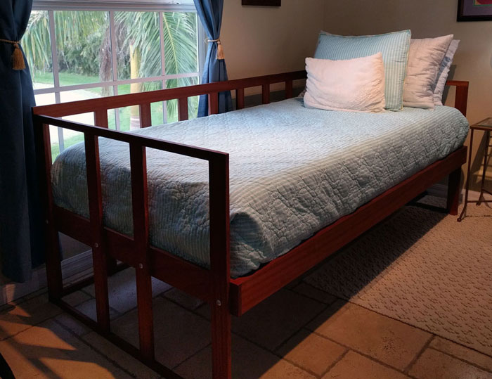 This Sapele daybed was designed and built from only a picture sent in by the client. A spare reading room needed to convert into a sleepover area for visiting children. The solution was to incorporate a daybed for reading and watching television but create a resting area when needed. We utilized a Tuft & Needle foam mattress in the Twin XL size to maximize the sleeping area. The bed was constructed into four major sections for delivery and setup; the mattress frame, the back and two sides make up the structure and is easily bolted together with large 10mm aluminum bolts.