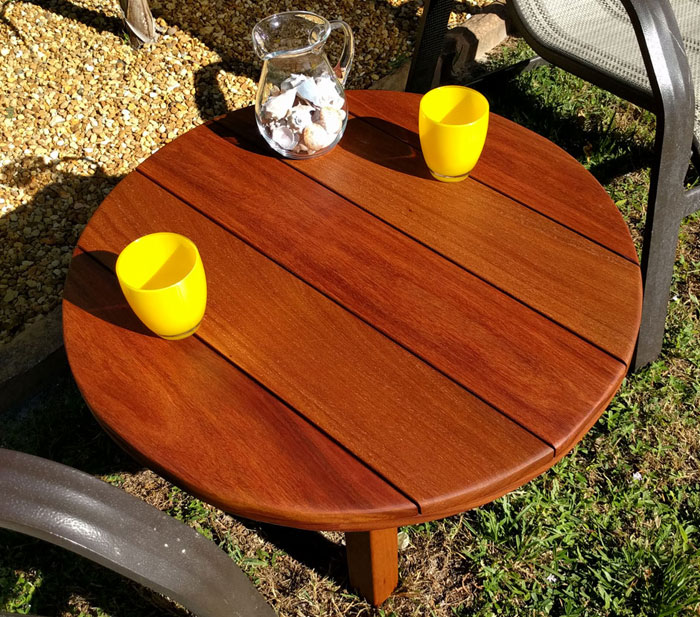 This cumaru cocktail table is the perfect size to drop into any sitting area. This particular table was designed to sit low between two adirondack style loungers on a screened lanai next to a canal.