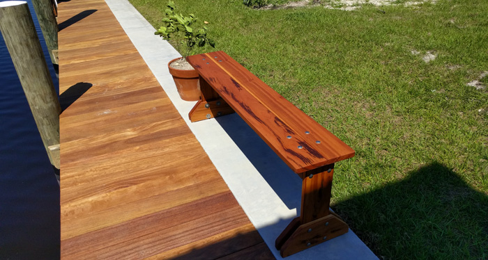 The Tigerwood dock bench is crafted from 1" thick hardwood. The leg supports have 3-1/2" thick tigerwood angle braces at the bench underside and the bench has an additional 1" brace hidden underneath that runs the entire length for incredible strength. The four oversize feet extend beyond the edges of the seating area to prevent any tipping. The bench is mechanically fastened together with marine-grade stainless steel carriage bolts, over-size washers and nylon locking nuts so it will never need any adjustments.